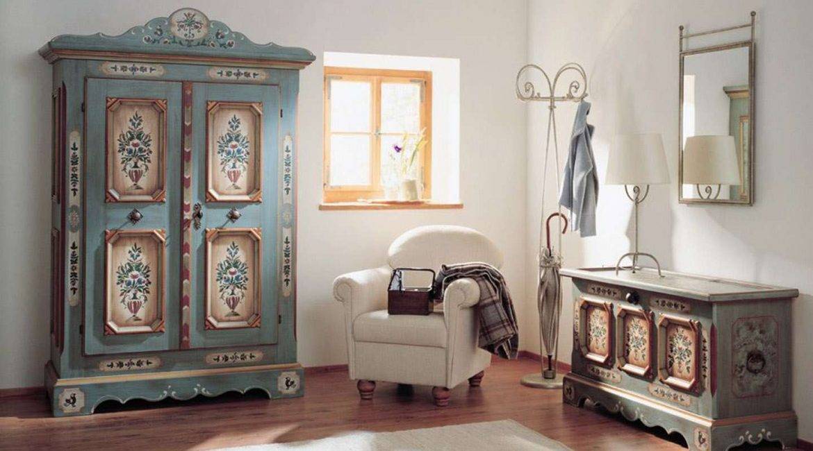 Мебель, расписанная под народные промыслы, отлично вписывается в русский стиль — лучше, чем в какой-либо ещё. Также подходит для детской, в которой можно проявить фантазию и совмещать вещи по желанию, а не по канонам стиля.