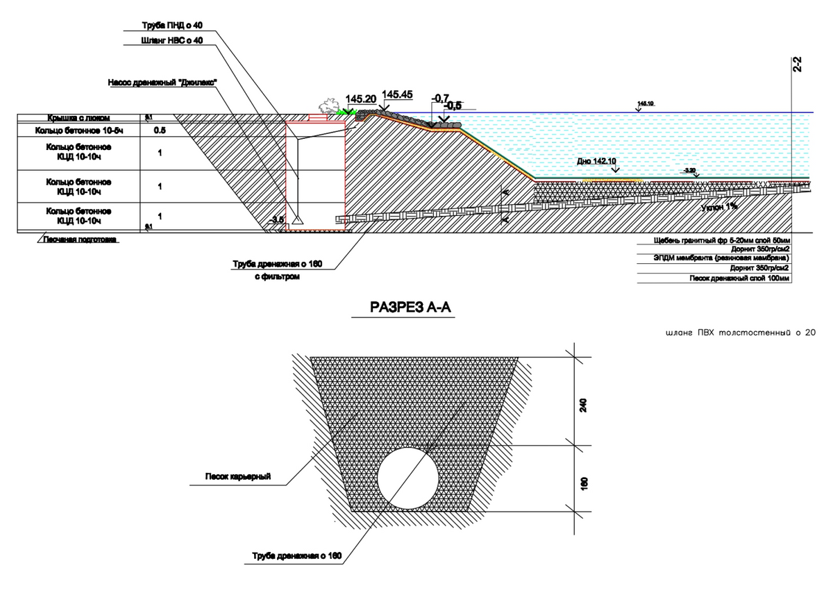 Схема дренажа пруда для одного из наших проектов