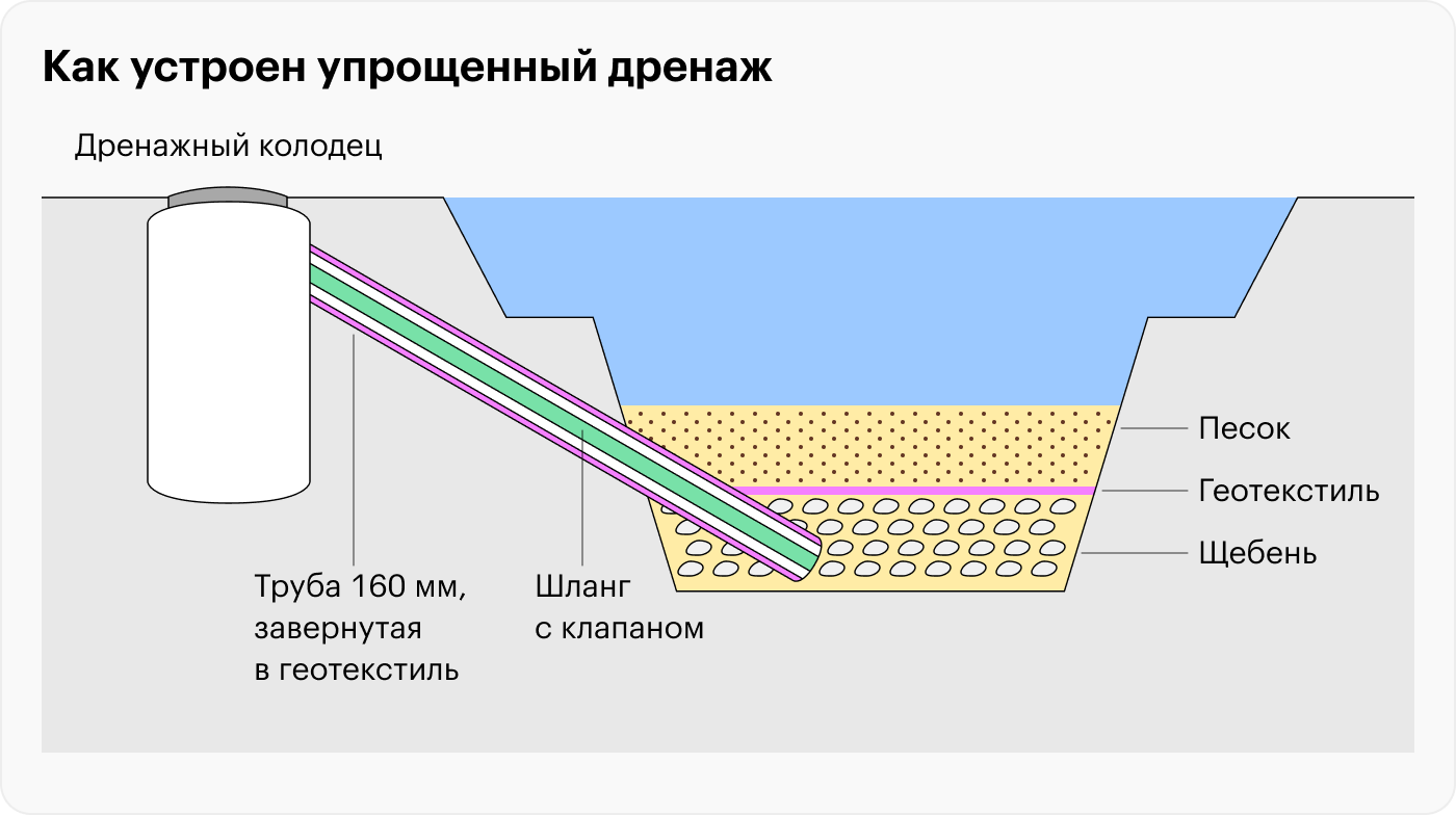 Под гидроизоляционной пленкой в почве накапливаются газы, а весной, после таяния снега, еще и подтекает вода. Это надувает и поднимает пленку со дна, могут обрушиться декоративные камни. Чтобы вывести газы и лишнюю влагу, делают дренаж.