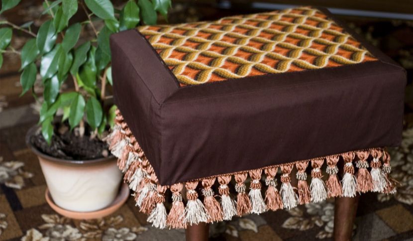 Из выбранного наполнителя необходимо вырезать круг, диаметр которого должен равняться 50 см. Наклеить его на сиденье табуретки и дать клею полностью высохнуть. Это время можно посвятить обивке. Из подготовленной ткани нужно вырезать боковые заготовки, отталкиваясь от размеров табурета. При этом необходимо оставить несколько сантиметров с каждой стороны про запас. Также нужно вырезать круглую заготовку, диаметром, как и заготовка наполнителя (около 50 см.). По всему ее краю необходимо сделать приметочную строчку, слегка затянув ее. К узким краям боковых заготовок нужно пришить липкую ленту. Нижние края слегка подрубить. Верхние края боковых заготовок пришить к круглому основанию. Проделывать данную работу рекомендуется с изнаночной стороны, во избежание некрасивых швов. Если вдруг они все-таки получились, данную проблему легко задекорировать при помощи различных лент или бусин, которыми можно обшить неудачные швы на лицевой стороне. Получившийся плотный чехол остается надеть на табурет. Таким образом получился изящный и стильный пуфик с мягким сиденьем!