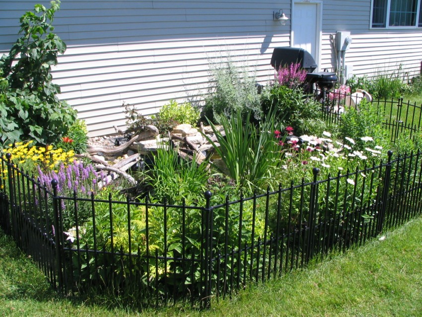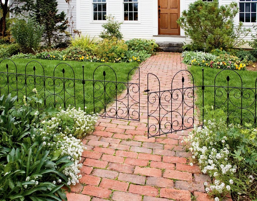 Наиболее красивые палисадники, где кованые из металла заборы. Они более сложные в установке, потому что тяжёлые и ставятся на фундамент. Зато выглядят монументально, законченно. Можно установить невысокий металлический штакетник.