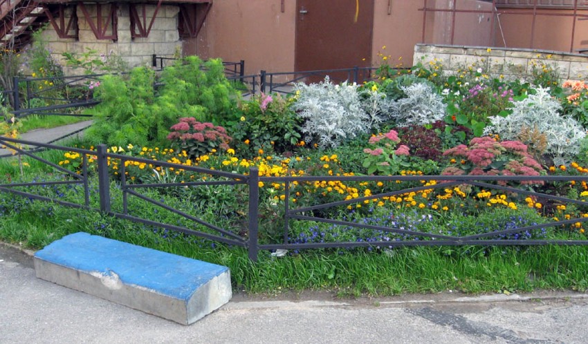 Уделять внимание только центральной части цветочной композиции нельзя. А для этого в остальных частях палисадника высаживаются яркие растения. Обычно их размещают перед входом в дом или возле калитки, то есть в тех местах, которые всегда на виду