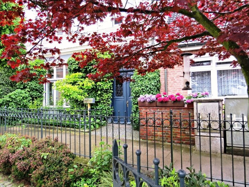 Вызывают восхищение по-немецки правильные палисадники. Их прямоугольные клумбы засаживают шалфеем, маргаритками, бархатцами, петунией. Всю эту красоту обносят штакетником. Через палисадник можно пустить дорожку, вымостив ее ассиметричной разноцветной плиткой. Завершенность композиции придадут расставленные и развешенные на крылечке кашпо и вазоны с самшитами.
