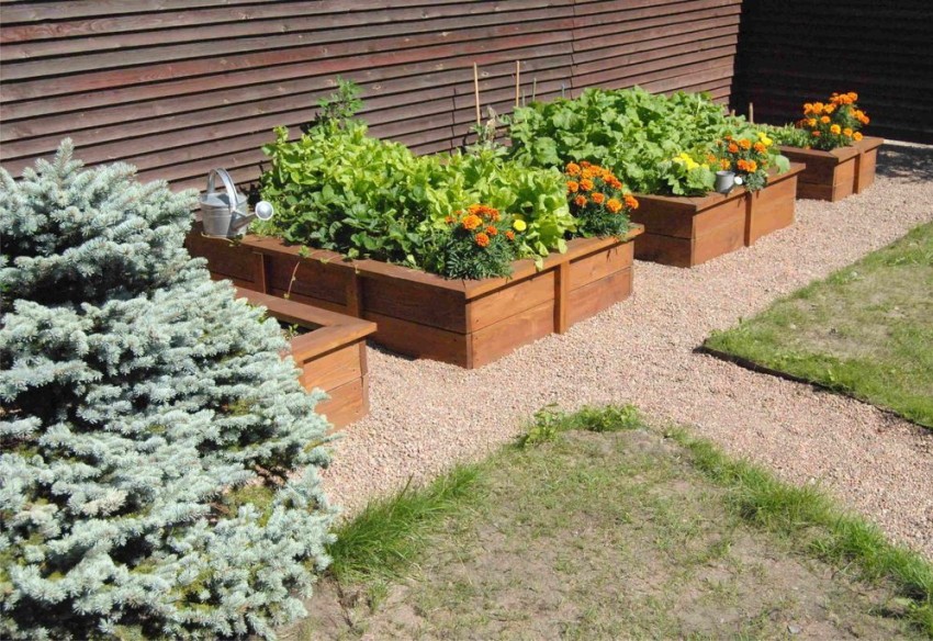 Такой способ выращивания урожая имеет свои преимущества. Благодаря тому, что грядки находятся на некоторой высоте, за ними легче ухаживать. По этому принципу устраиваются приподнятые цветники: огораживается досками место возле забора или крылечка, и внутри высаживаются однолетники, многолетники, декоративные кустарники или деревца.