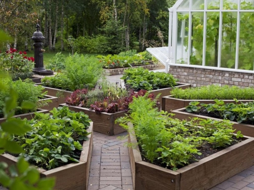 Огород. Грядки с овощами тоже могут красиво вписаться в дизайн. Для этого подойдут красиво цветущие овощи.