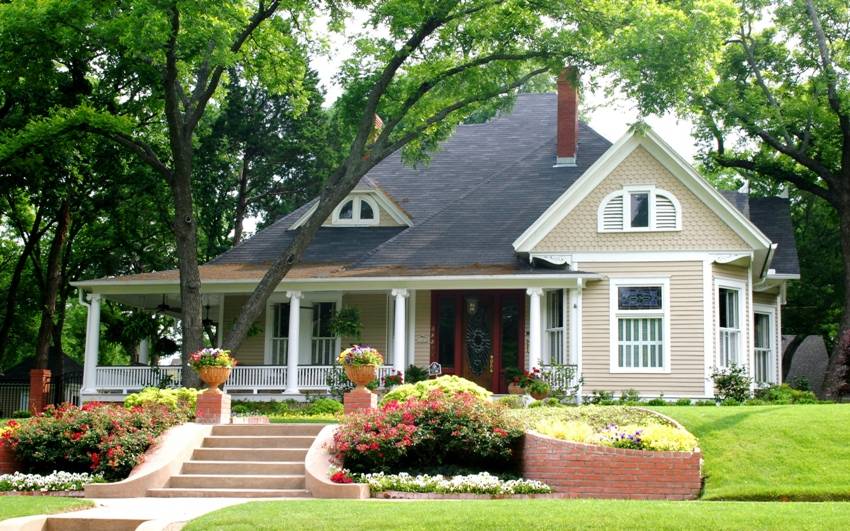 При самостоятельном декорировании зоны возле дома нужно правильно выбрать растительность. Подчеркнуть эстетичный облик деревянного строения, построенного из бревен, помогут высаженные в палисаднике колокольчики или полевые ромашки. Для домика на даче в стиле шале идеальным решением станут туи и ели. Большие постройки в европейском стиле декорируйте палисадниками с газонной травой и небольшими кустарниками.