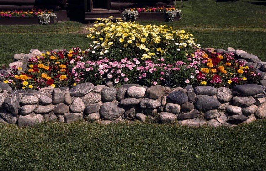 Для этого при оформлении клумб достаточно использовать те же строительные материалы, что при сооружении дома, одинаковые по цвету тона.