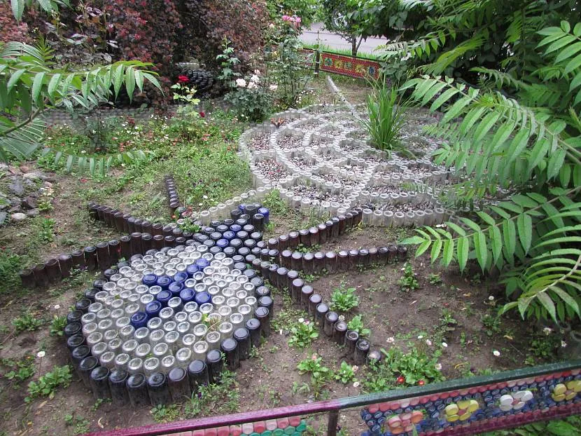 Оригинально смотрятся тропинки, сделанные из пластиковых бутылок. Нужно подобрать бутылки одинаковой емкости, наполнить их песком, и вкопать (горлышками вниз) в виде бордюра по обе стороны от дорожки. Внутреннее пространство засыпается песком или гравием и уплотняется – и ходить мягко, и вода быстро уходит, и грязь не скапливается.