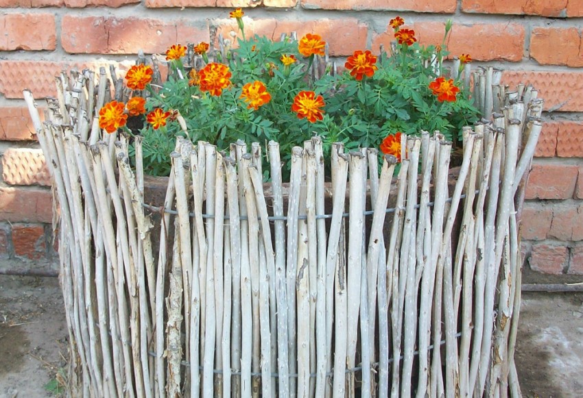 На строительство забора можно пустить то, что имеется в достаточном количестве. Бюджетным материалом являются тонкие ветви лесных деревьев. В землю вбиваются колышки, высота которых равна высоте забора плюс 20 – 30 см (столько будет находиться в почве), и оплетаются гибкими прутьями, лучше всего ивовыми. Если прутья очень тонкие, их лучше брать по несколько штук. Более толстые ветки толщиной 2 – 3 см, их вплетают по одной.