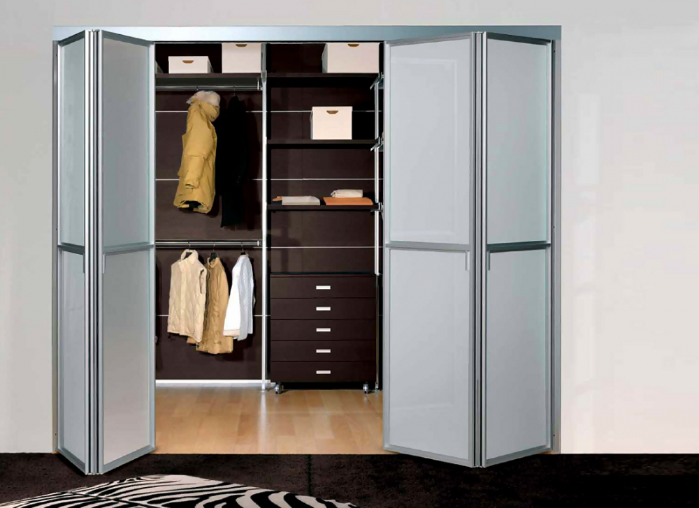 Оптимальный вариант в условиях ограниченного пространства. В процессе эксплуатации складные двери для гардеробной собираются пополам, а потом сдвигаются в нужную сторону. Их основным преимуществом является эффектный внешний вид. Они способны стать оптимальным вариантом для помещения, оформленного в стиле минимализма.