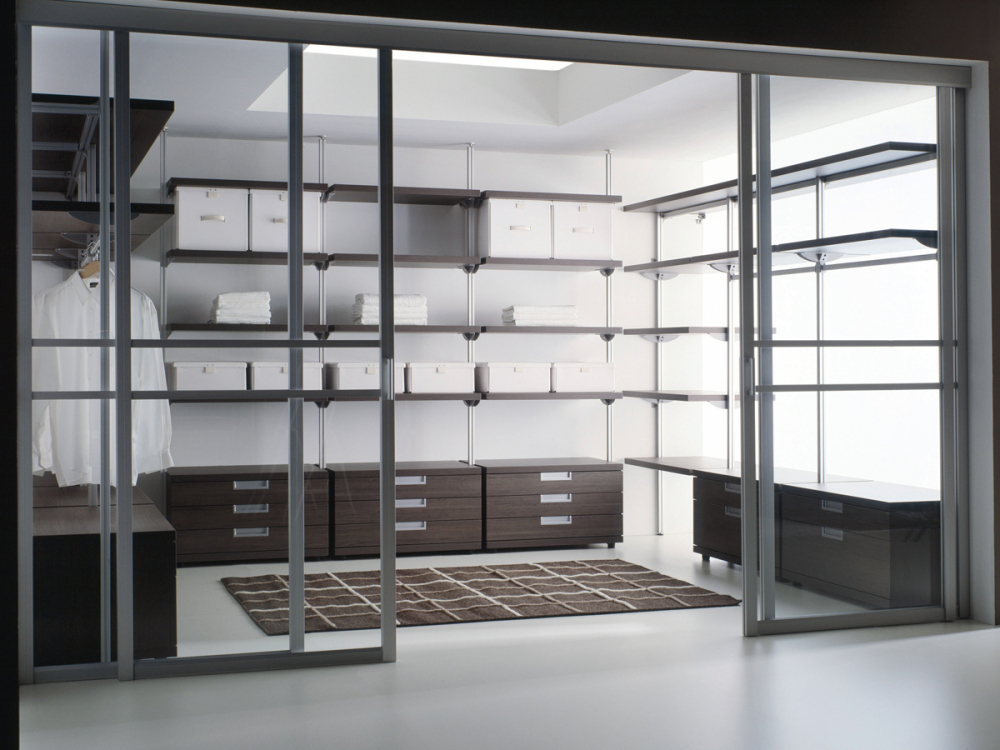 Стеклянные полотна, усиленные каркасом из стали или алюминия, являются распространенным решением, придающим современный вид интерьеру гардеробной комнаты. Для безопасности с обратной стороны стекла расположена специальная пленка, которая не даст осколкам разлететься в разные стороны если стекло случайно разобьется. Стекла для дверей обязательно закаленные, поверхность, в зависимости от конкретного типа помещения, может быть глянцевой, матовой или даже цветной.