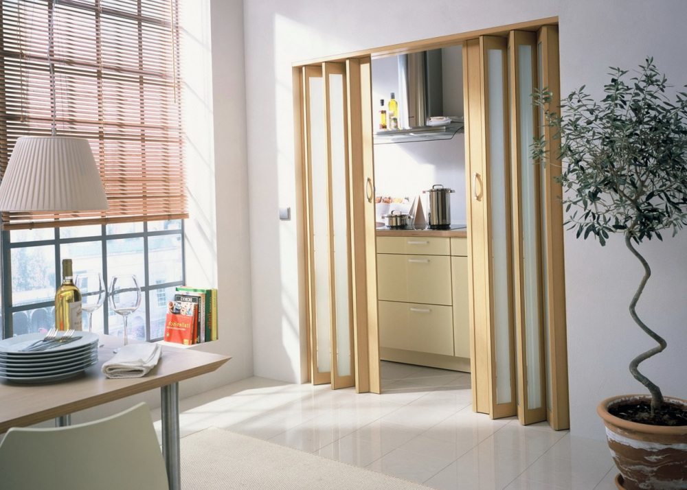 Такая складная конструкция схожа с «книжкой», но с разницей в том, что в ней задействуется большее число створок. Она состоит из нескольких ламелей, которые складываются одна в одну. В зависимости от ширины проема, их количество может достигать 10 штук.