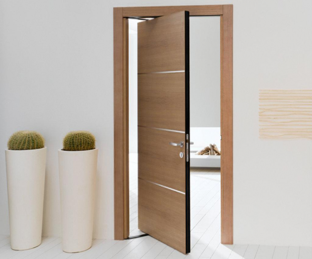 Рото-двери. В основе этой конструкции заложен поворотный механизм, который позволяет двери вращаться вокруг собственной оси и при этом открываться в любую из сторон. Цена двери для гардеробной комнаты такого типа довольно высокая, и начинается от 35 тыс. руб. за комплект (полотно, рото-механизм, фурнитура, коробка и наличники). Помимо стоимости, к недостаткам можно отнести тот факт, что едва ли вы сможете сэкономить пространство при установке такой конструкции. Но, тем не менее, смотрится рото-дверь в интерьере просто неповторимо.