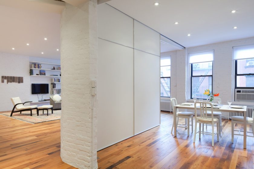 Раздвижная перегородка между кухней и гостиной – используется конструкция, аналогичная дверям шкафа-купе. В зависимости от величины проема двери могут устанавливаться непосредственно на стены и крепиться к потолку, или же отгораживать часть пространства и сочетаться с фальш-стеной, например.