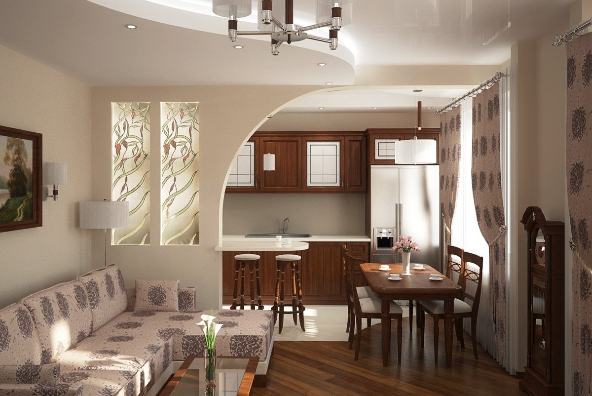 Объединение кухни с гостиной с последующей установкой переборки иногда предполагает снос стен