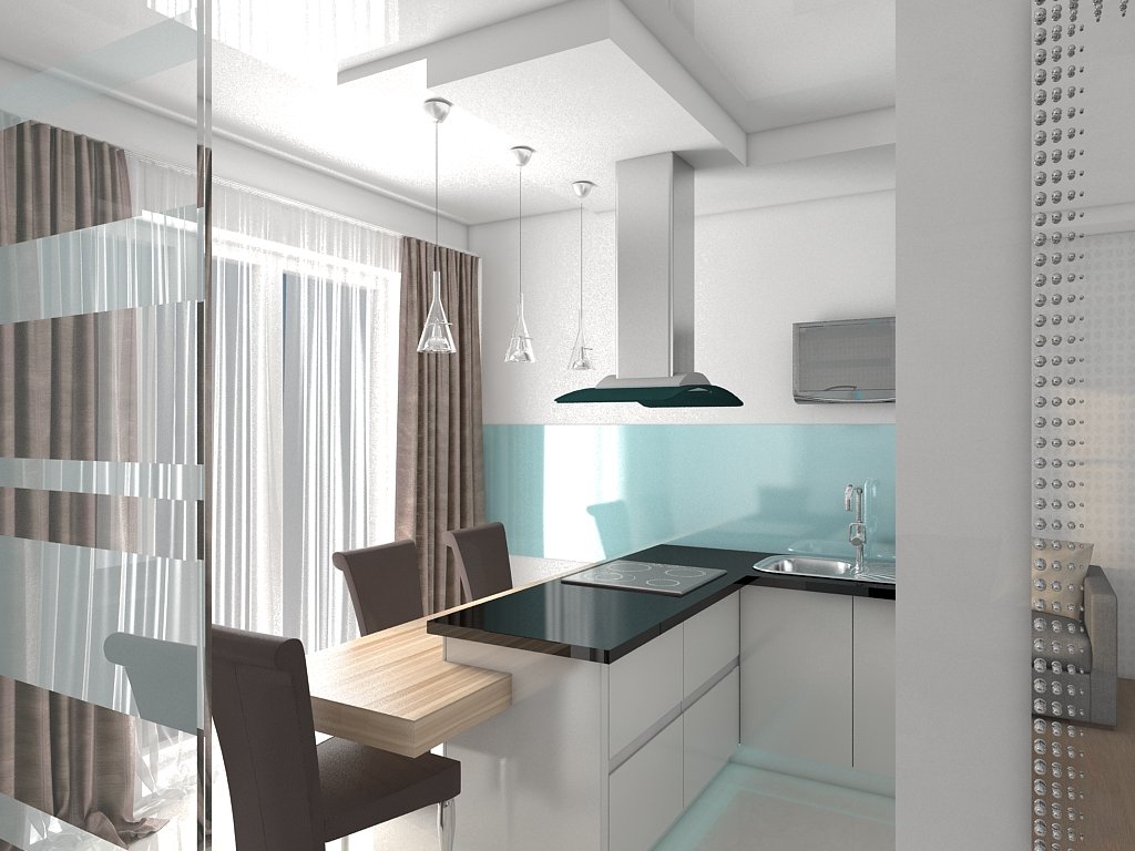 Если же не хочется создавать перегородки, можно провести зонирование с помощью мебели. Нестандартное расположение кухонного гарнитура позволит разграничить пространство и визуально, и практически.