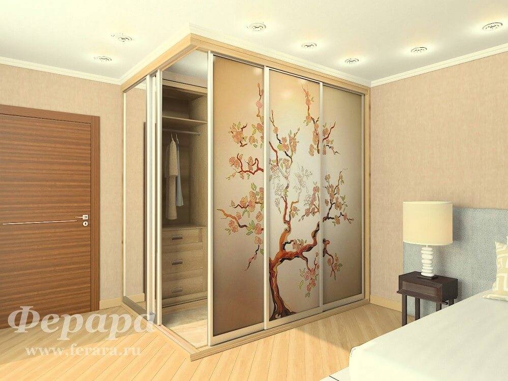 Интересным дизайнерским решением является зеркало, на котором вытравлен матовый рисунок. Такие фасады дверей придают интерьеру комнаты оригинальности.