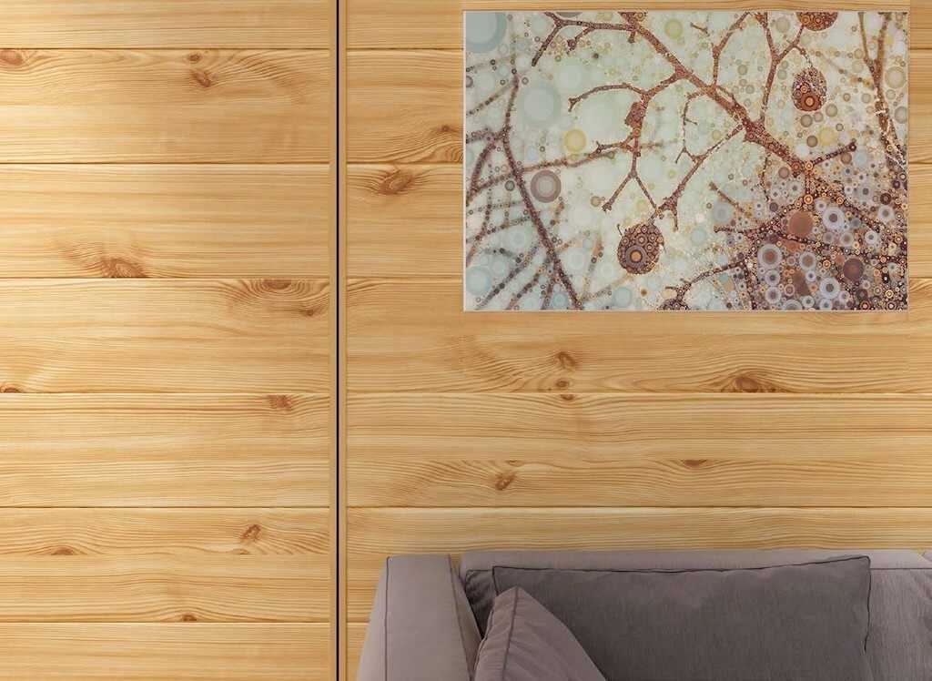 Вид, имитирующий натуральное дерево, имеют шпонированные МДФ-панели, используемые чаще всего для отделки стен. Снаружи на такой волокнистой плите действительно закрепляется тонкий слой древесины, который принято называть шпоном. Импозантный внешний вид приятно дополняется более доступной стоимостью по сравнению с натуральным деревом.