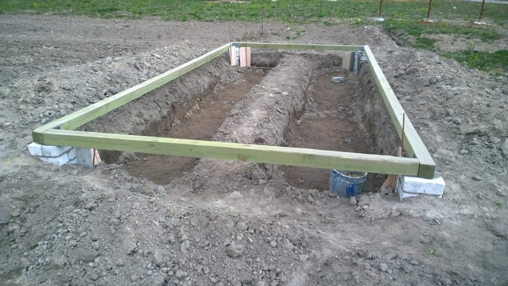 - рытье траншеи под основание. Глубина рассчитывается с учетом необходимой высоты фундамента (400 мм) и амортизирующей «подушки» из щебня, гравия или песка (50…100 мм), что составляет 500 мм. Ширина – 250…300 мм;