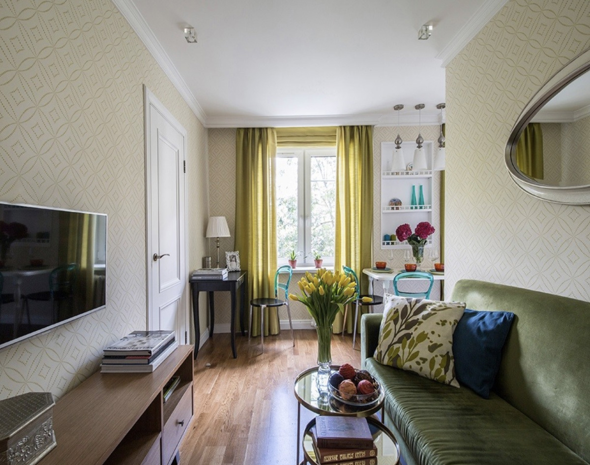 - Мебель и шторы лучше сочетать по цвету или выбирать преимущественно однотонные цвета. В интерьере нужно отходить от стереотипов «светлое и бежевое» и отважиться на яркие и тёмные цвета.