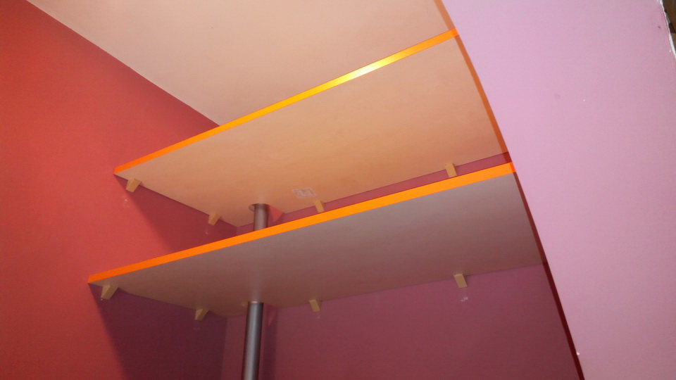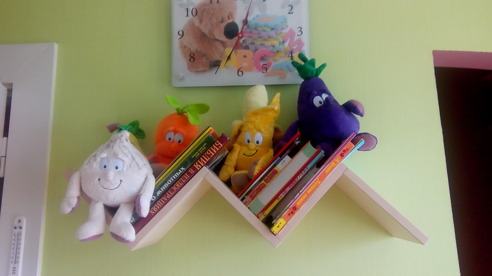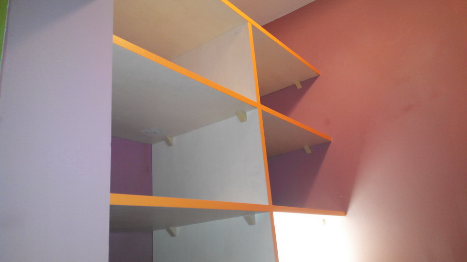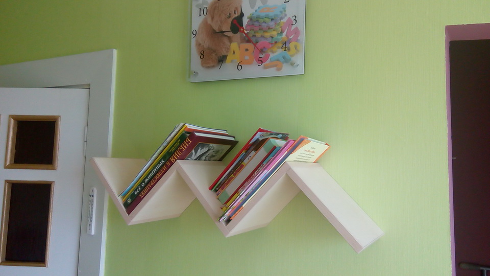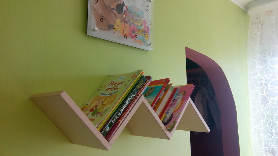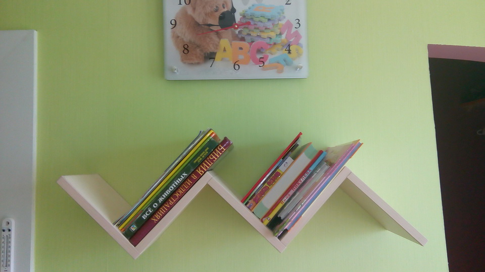 С полками я решила немного поэкспериментировать, поэтому на одной стене их сделали прямыми, а на другой – “ёлочкой”.