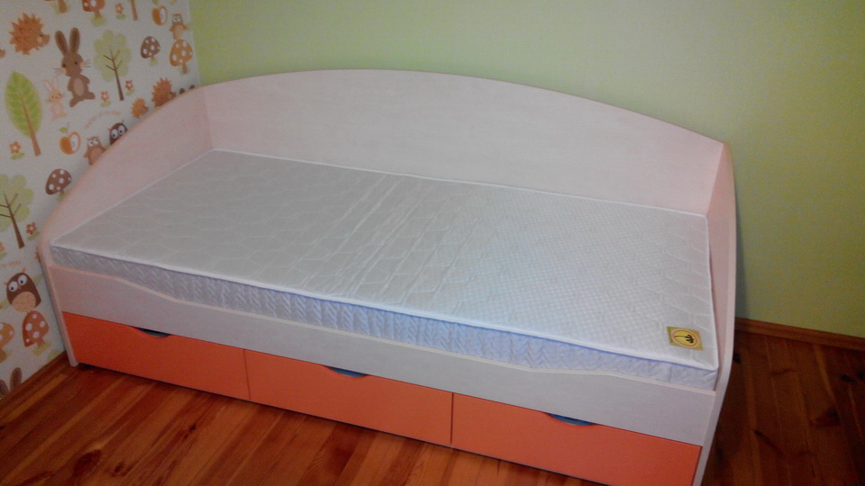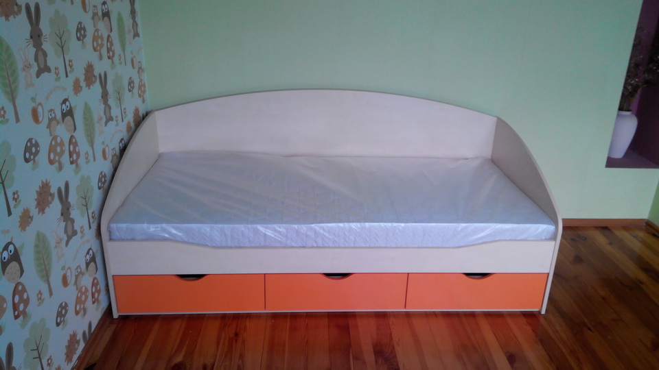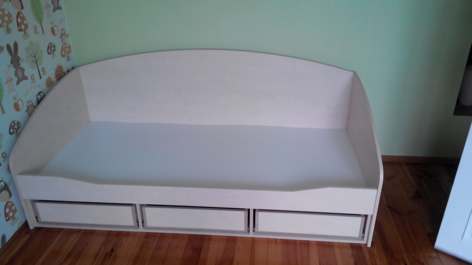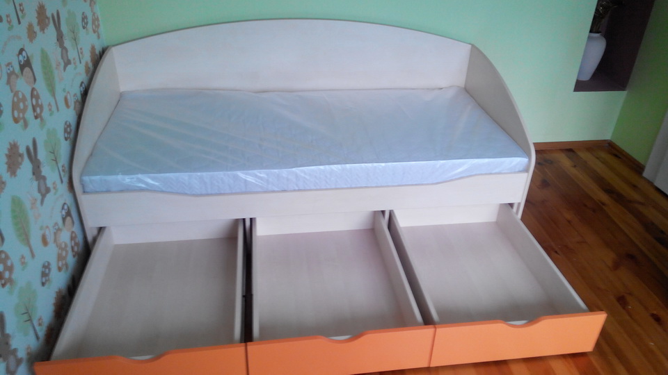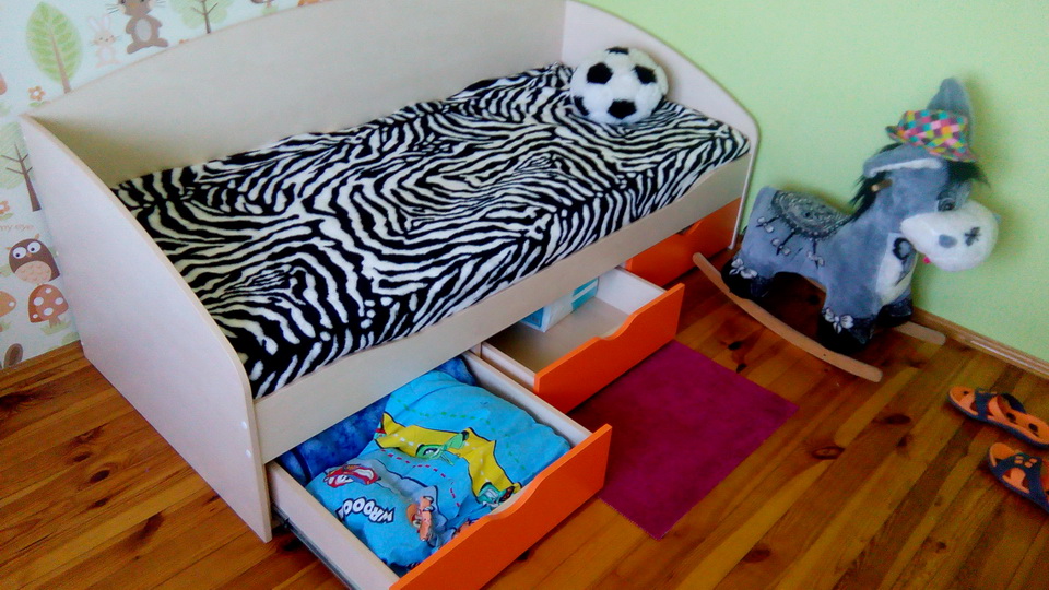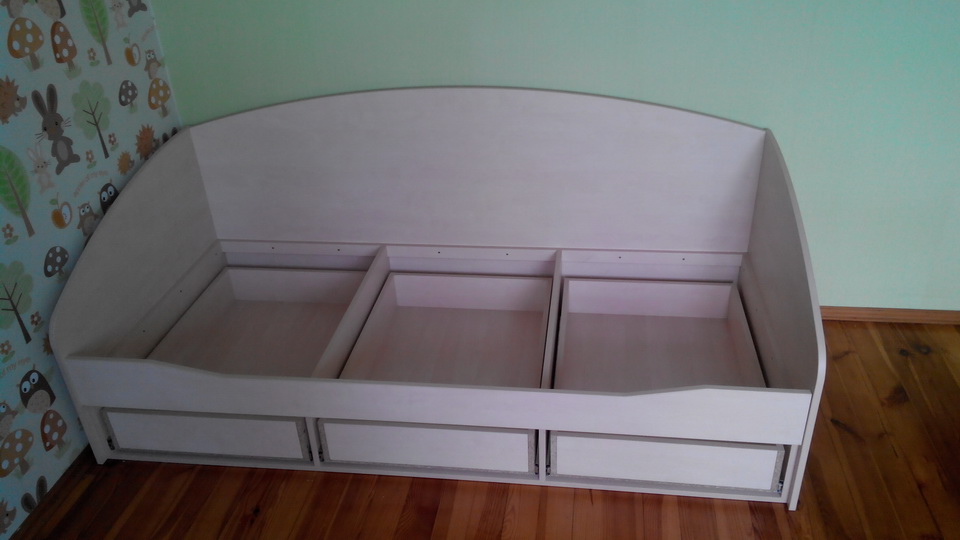 Кровать я хотела “полуторку” с выдвижными ящиками снизу и с высокими стенками с трёх сторон. Вот как получилось реализовать это на практике.