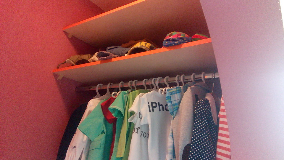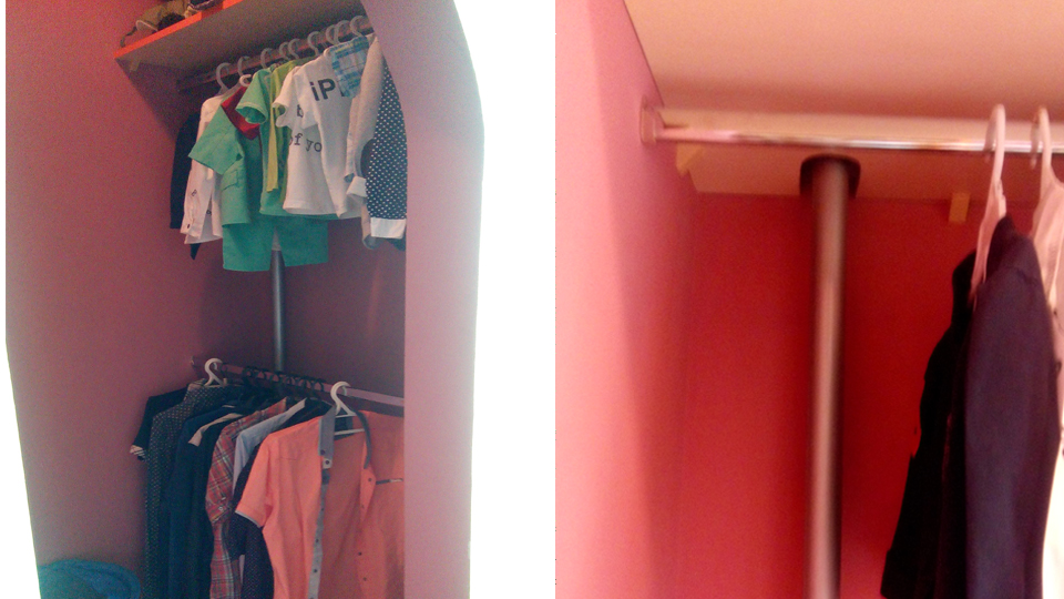 На этапе планирования перед мной вновь стал сложный выбор – с какой стороны делать полочки, а с какой крепить трубы для вешалок?