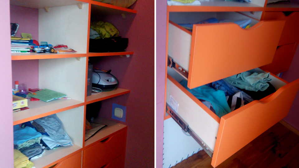 Вот уже спустя месяц, как сын “переехал в отдельные апартаменты”… На полках появились детские игрушки и книги, выдвижные ящики кровати вместили в себя подушки, одеяла, памперсы доченьки, салфетки и др., а гардеробная комната преобразилась детской одеждой.