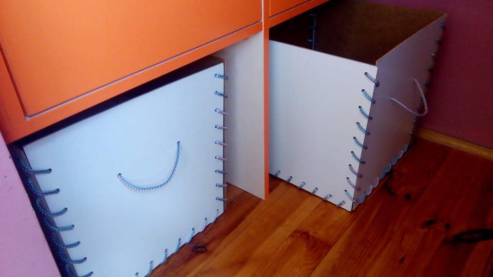 . Купила в хозяйственном магазине верёвку и попросила мужа нарезать ДВП ровными кусками определённого размера, просверлив при этом отверстия по краям. Когда муж отдал мне “заказ”, я связала всё верёвкой в оригинальные ящики, которые гармонично вписались в интерьер детской.