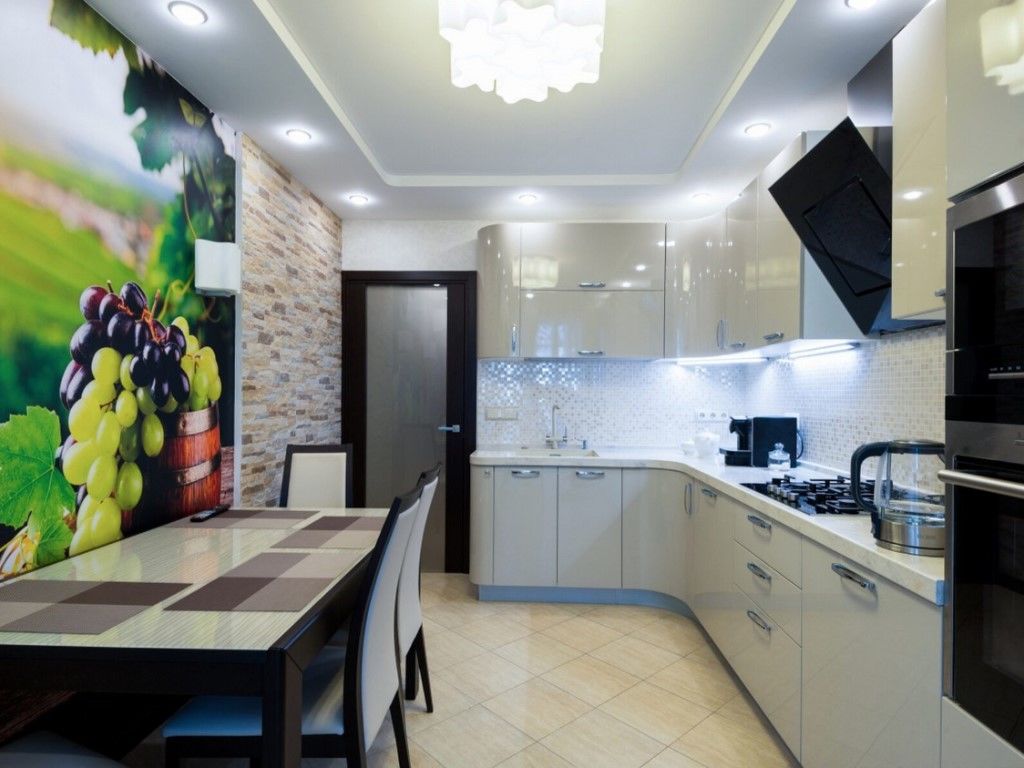 Для обновления кухонной стенки можно использовать очень интересный прием – оклейку фотообоями. Изображения на них могут ограничиваться только вашей фантазией. Ведь сегодня есть возможность не только выбрать цвет и узор в магазине, но и заказать любой другой в типографии. Для этого можно также использовать фотографии из личного архива.