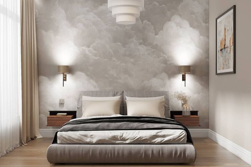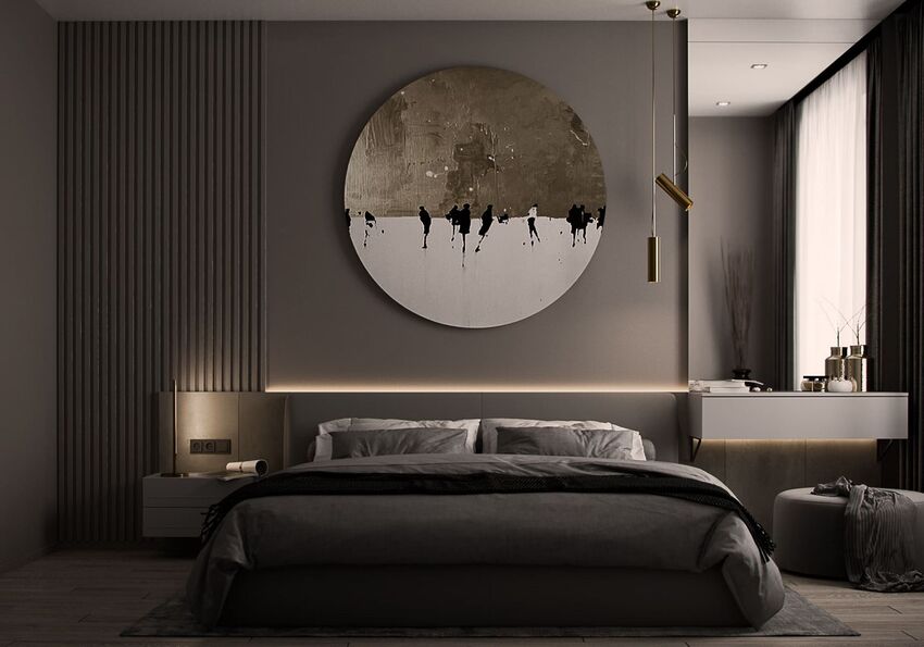 Стильная спальня с ярким панно на стене