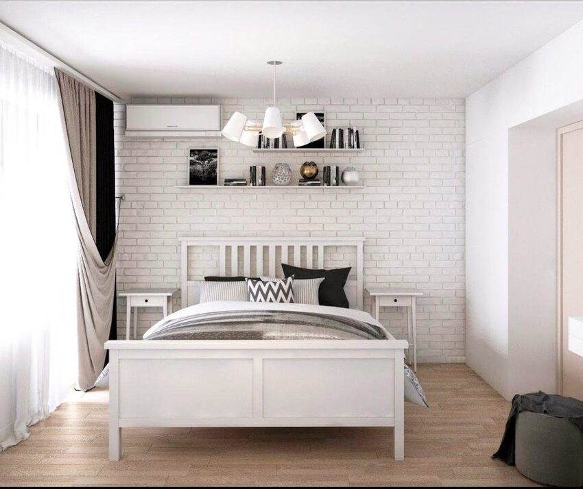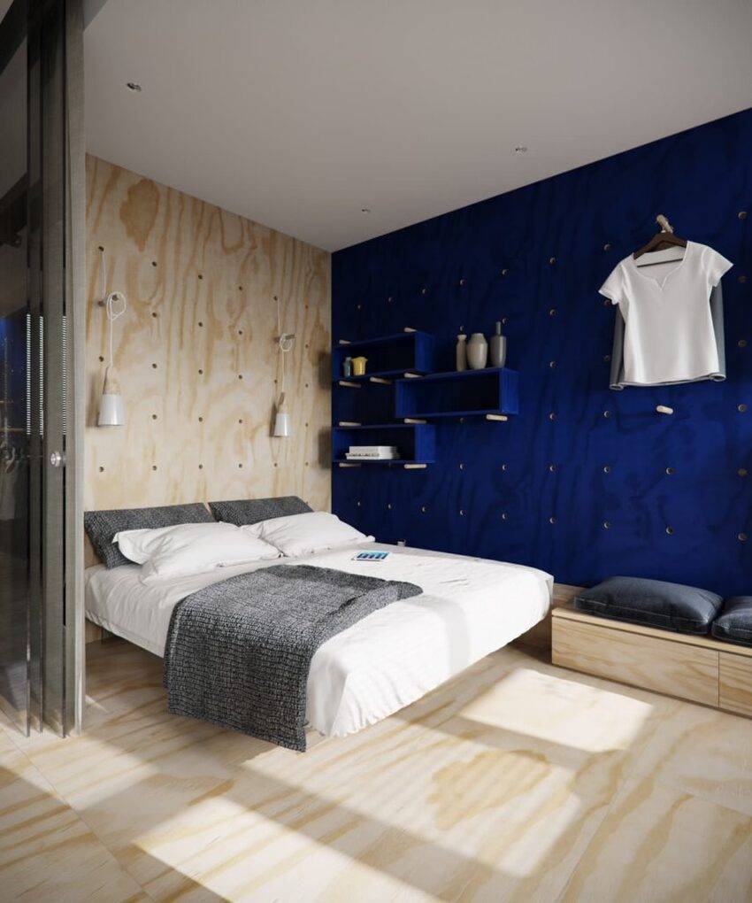 Кровать размещается по центру, у изголовья одной из стен, гардероб устанавливается у глухой стены.