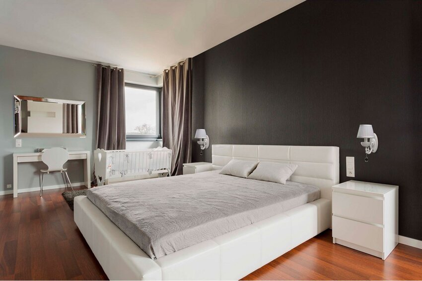 Что касается пола, наиболее популярным вариантом в современных спальнях является ламинат – это практичное и недорогое покрытие, которое стильно смотрится и имеет большое разнообразие моделей: вы можете выбрать имитацию дерева разных цветов или яркие варианты. Также спросом пользуется паркет, хотя это покрытие более дорогое и капризное в уходе – его нужно беречь от царапин и избыточной влажности.