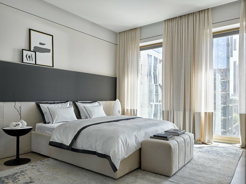 В отделке спальни в современном стиле используются натуральные и одновременно с этим сложные цвета: белый замещается молочным, желтый — горчичным и пр.