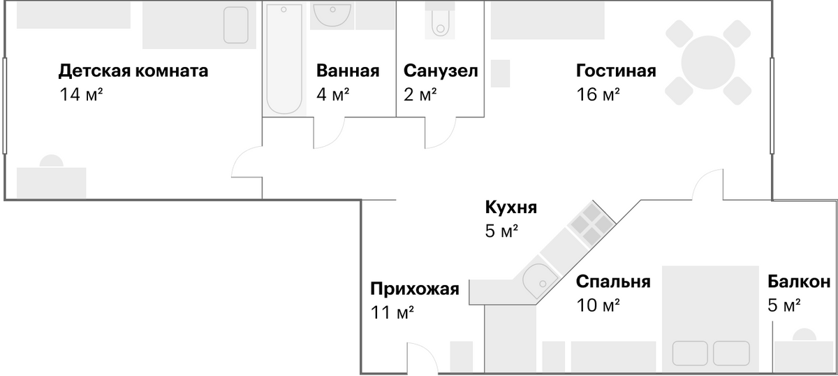 Вот такая получилась планировка: кухню перенесли в коридор и объединили ее с гостиной, а спальню объединили с балконом