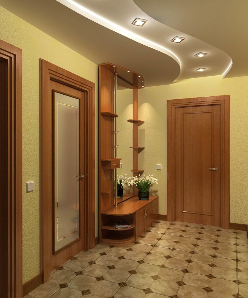Сделать комнату высокий и узкий коридор более приземленным поможет разноуровневый потолок из гипсокартона