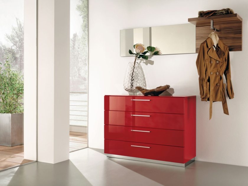 Такая гардеробная имеет два преимущества: устанавливается не только для ниш, но и для типовых прихожих, а второе, то что она может быть с любыми конструктивными или дизайнерскими особенностями на ваш вкус. У неё нет ни низа, ни боковых стенок (либо одна стенка), ни перекладины. Установка немного необычная, зато стоимость невысокая. Форма шкафа может быть прямой, угловой, буквой Г, радиусной или трапецией, опять-же есть где развернуться дизайнерской мысли. Глянцевые прихожие в современном стиле имеют множество вариантов устройства фасадов, внутренних отсеков, открытых полочек.