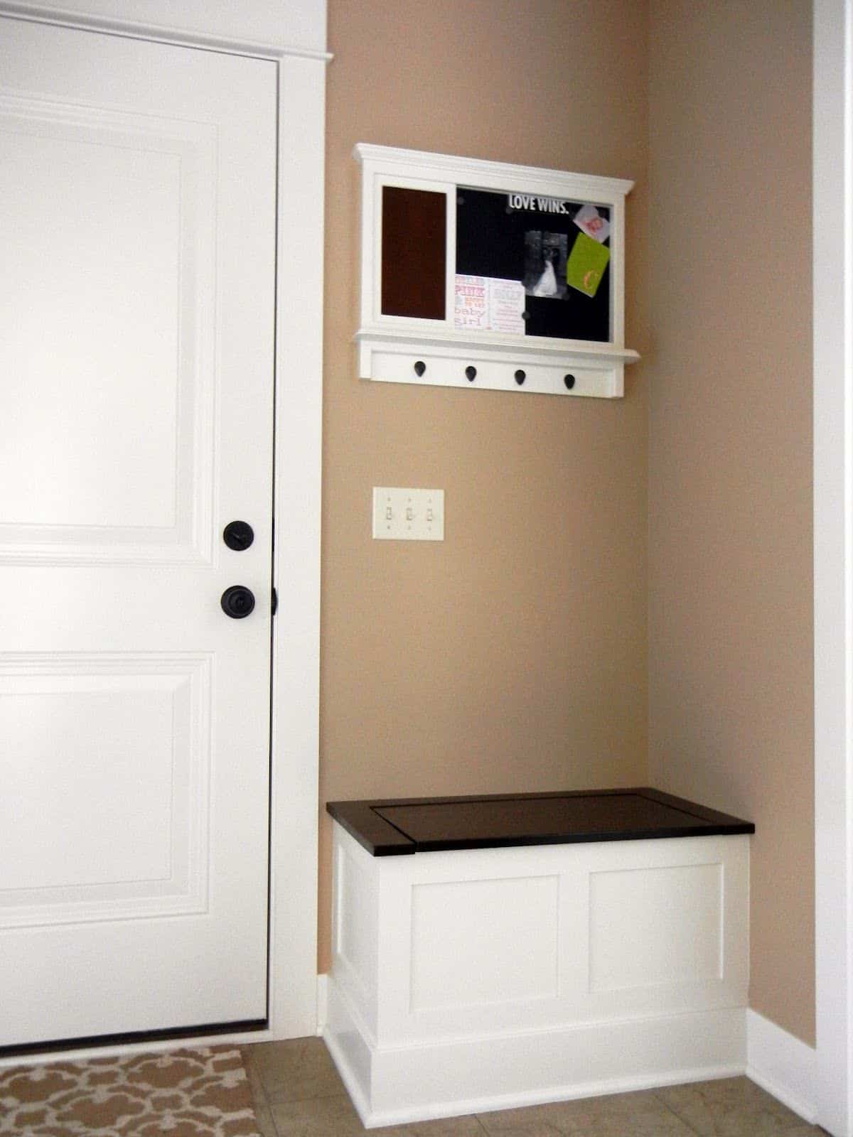 При отсутствии возможности установить шкаф, можно просто прикрепить к стене крючочки, а внизу установить пуфик с обувными ящичками, а можно повесить антресоли.