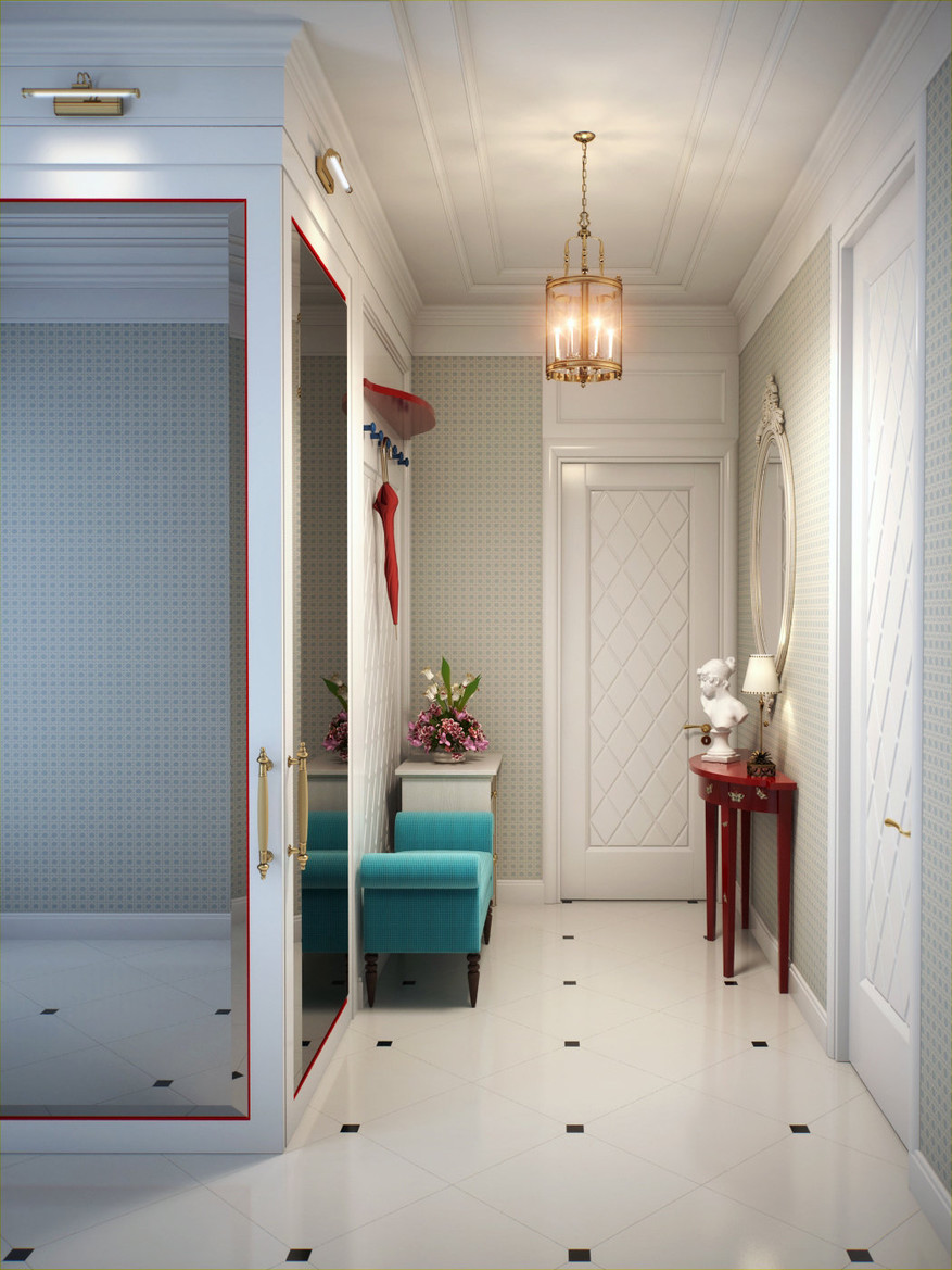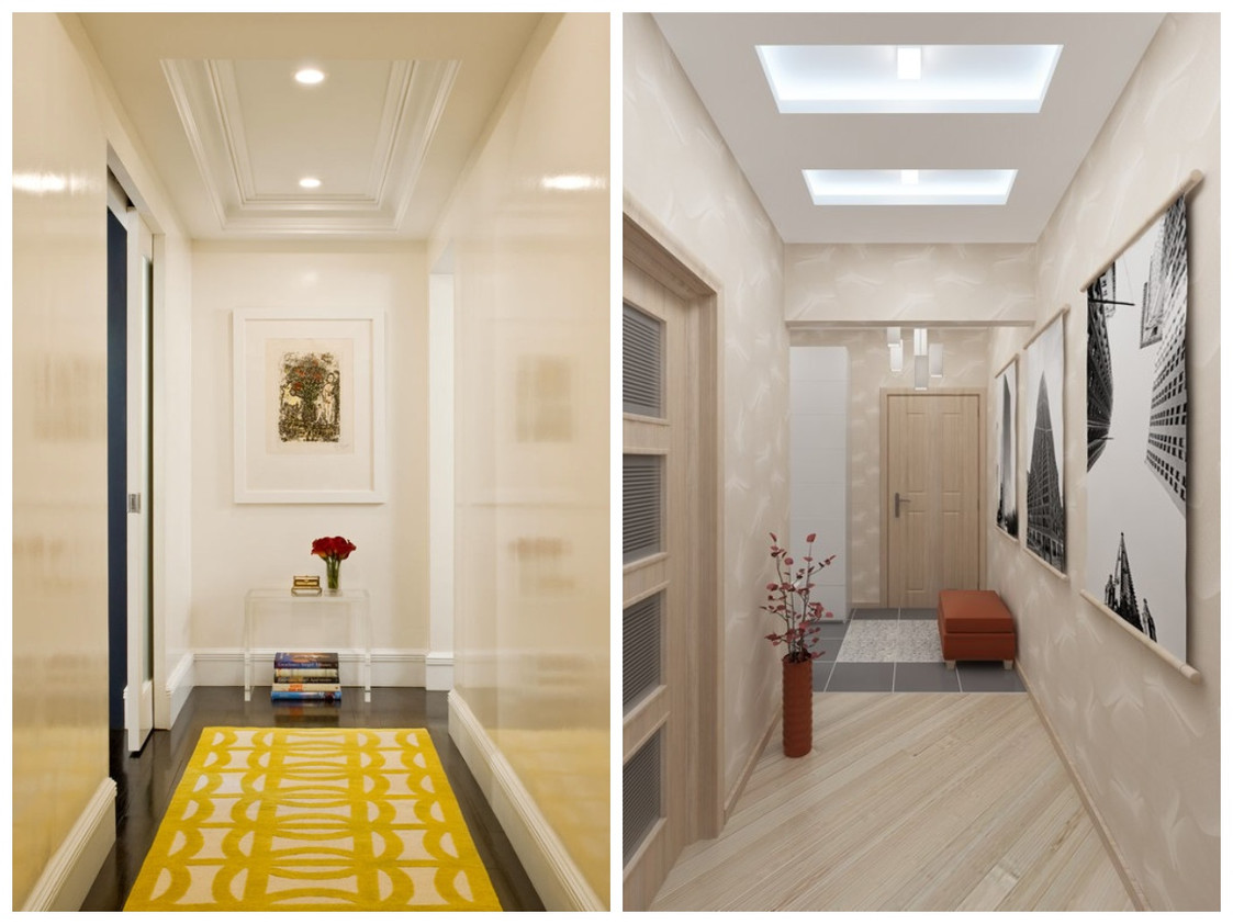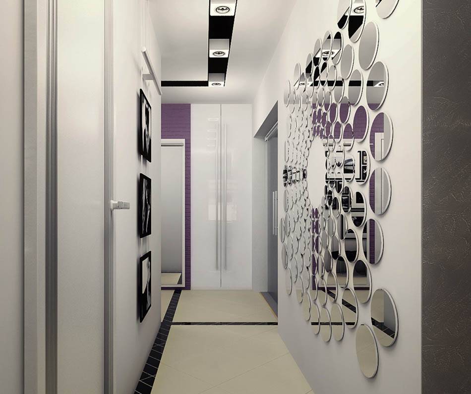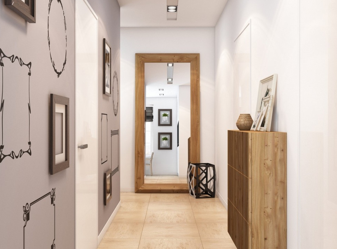Если вы намерены визуально расширить свободное пространство этой комнаты, то целесообразно установить натяжные потолки и прибегнуть к размещению больших зеркал. Если будет такая возможность, то по длинной узкой стене коридора можно разместить не глубокий шкаф-купе. Если нет такой возможности или желания, то заменить его можно установкой нескольких полок. Одежду можно развесить на специальных крючках