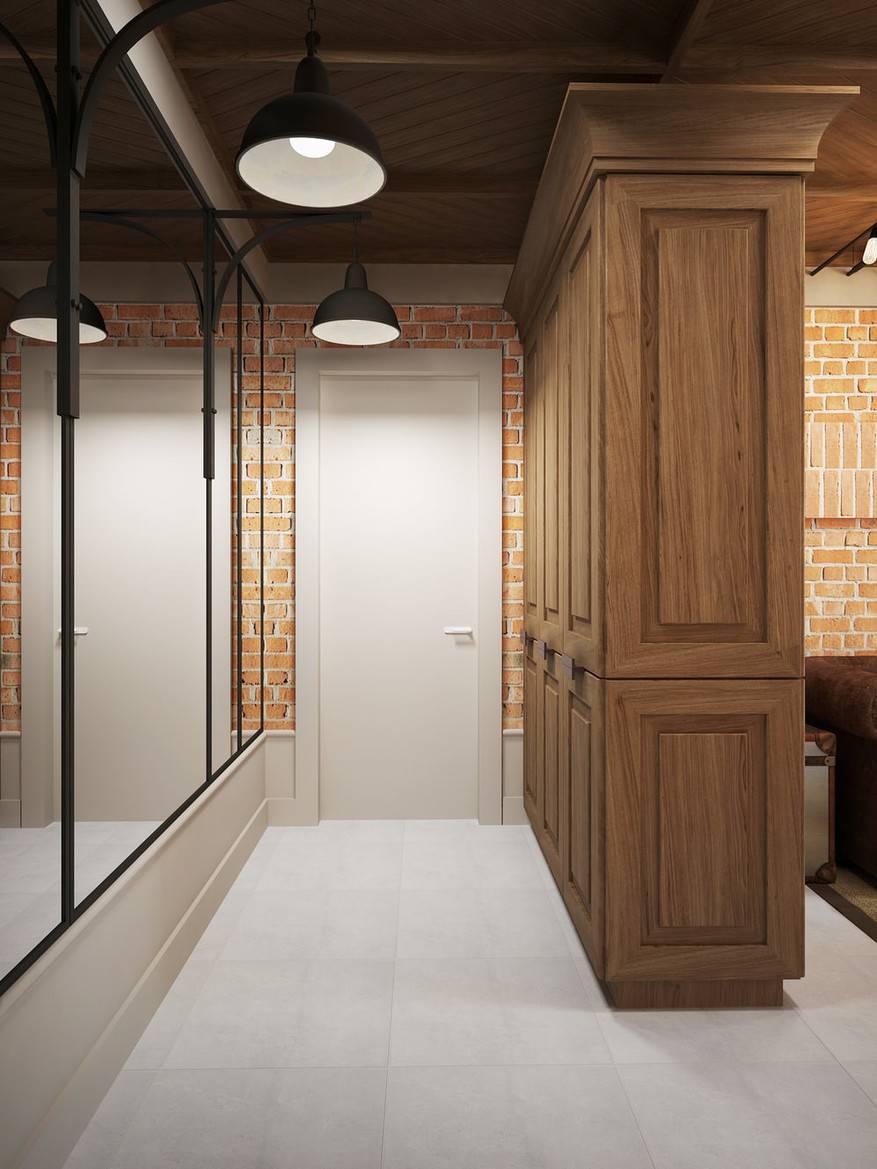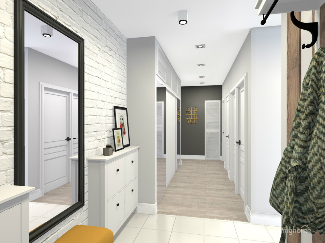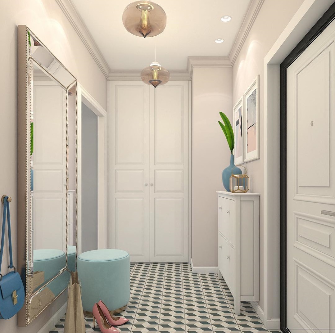 Если вы намерены визуально расширить свободное пространство этой комнаты, то целесообразно установить натяжные потолки и прибегнуть к размещению больших зеркал. Если будет такая возможность, то по длинной узкой стене коридора можно разместить не глубокий шкаф-купе. Если нет такой возможности или желания, то заменить его можно установкой нескольких полок. Одежду можно развесить на специальных крючках