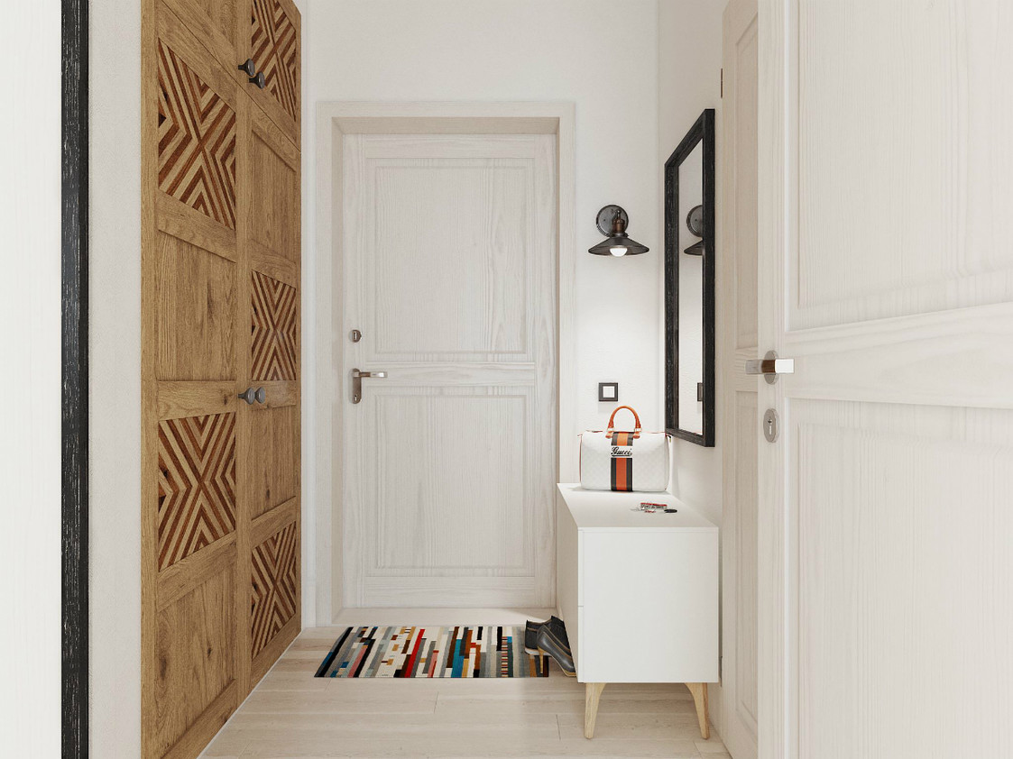 Совет. Для разделения прихожей и основных жилых помещений используйте стеклянные двери или прозрачные вставки в дверном полотне. За счет этого световой поток, проникающий из комнат в коридор, станет больше, благодаря чему зрительно увеличатся и размеры пространства.