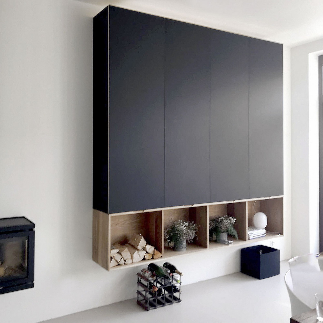 Шкаф тоже нужно делать от пола и до потолка. Если потолки высокие и конструктивно такие высокие двери сделать не получается, то опускаем потолок ровно в зоне шкафа. Сверху тоже не должна скапливаться пыль и хлам, плюс это выглядит более эстетично и воспринимается как встроенная монолитная мебель.