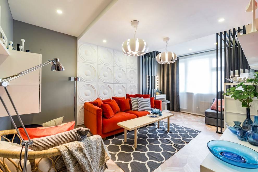 На фото показан пример выделения зоны гостиной с помощью 3D-панелей