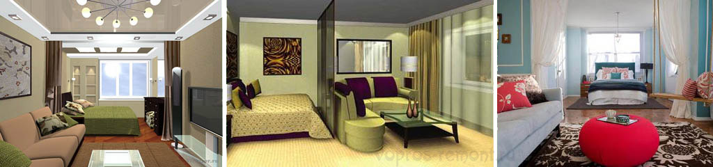 Деление зала на зоны для отдыха, спальную и рабочую можно сделать уже в порядке бюджетного ремонта и даже совсем без ремонта. Установка стеллажа или этажерки – совсем не строительная работа, но даст возможность как выделить зону спальни, так и спрятать ее от чужих глаз, см. рис.