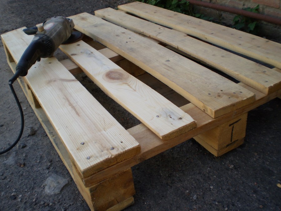 Шаг 3. Верхние доски, а также все элементы паллет, которые будут контактировать с кожей человека, нужно тщательно отшлифовать, используя шлифовальную машинку. Лучше всего отшлифовать все доски, не экономя времени.