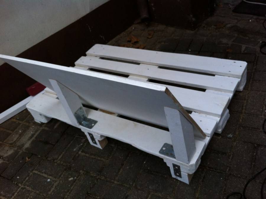 Шаг 6. Далее из отдельных отшлифованных досок и одной стороны паллеты нужно собрать спинку. Чтобы она была наклонной, нужно изготовить 2-3 опоры, закрепить их на основании, а к ним под углом прикрепить спинку-часть паллеты. Также спинку можно полностью собрать из отдельных досок.