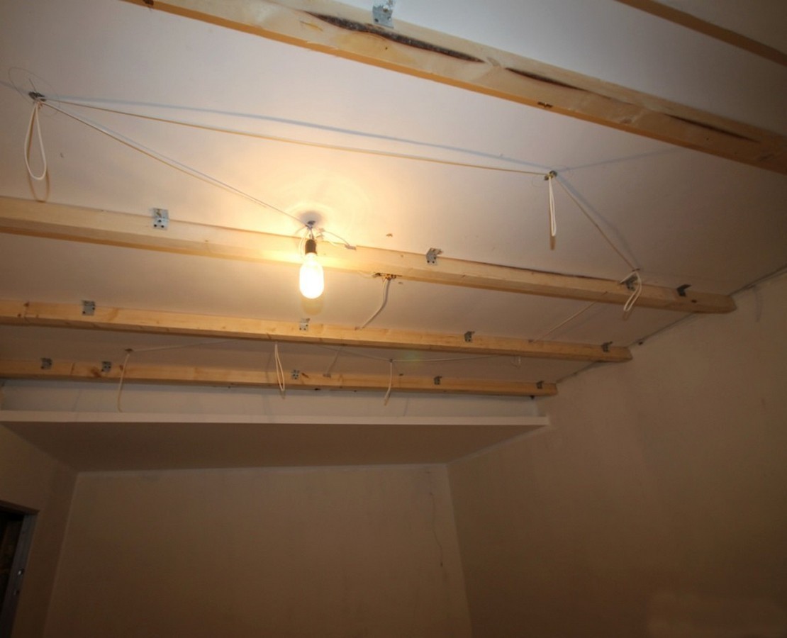 Чтобы скрыть коммуникации, провода, выложить утеплитель, каркасная конструкция опускается на соответствующую высоту. Расчет показателя простой – толщина утеплителя или размер сетевых трубопроводов плюс ширина базового основания для светильника.