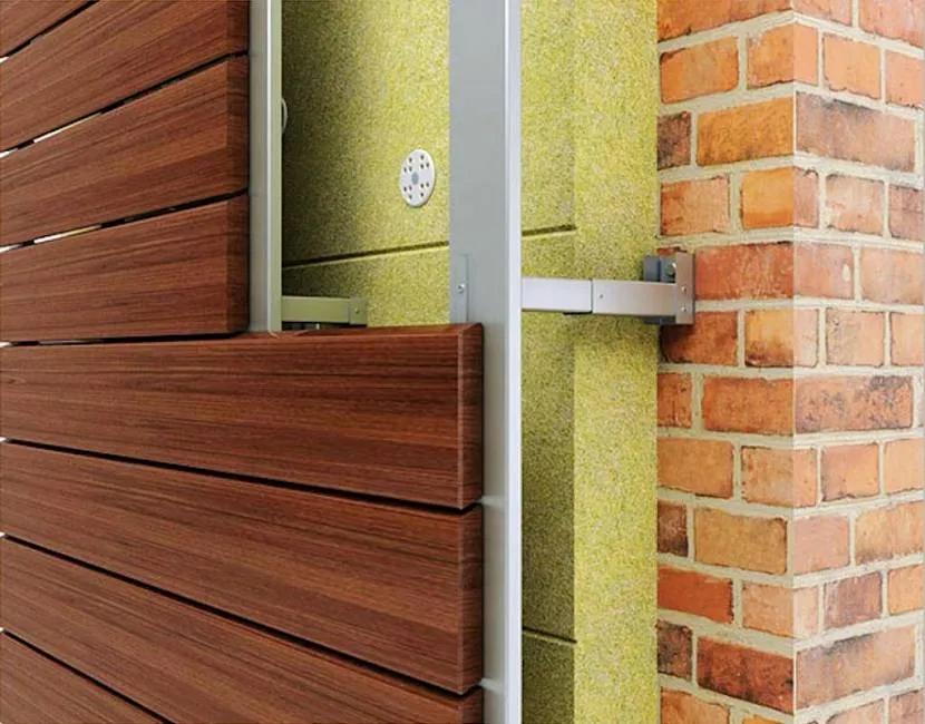 - Под каркас навесного фасада может быть актуален монтаж теплоизоляционных материалов – при этом придётся установить и гидроизоляцию. Работы производятся с учётом толщины утеплителя.