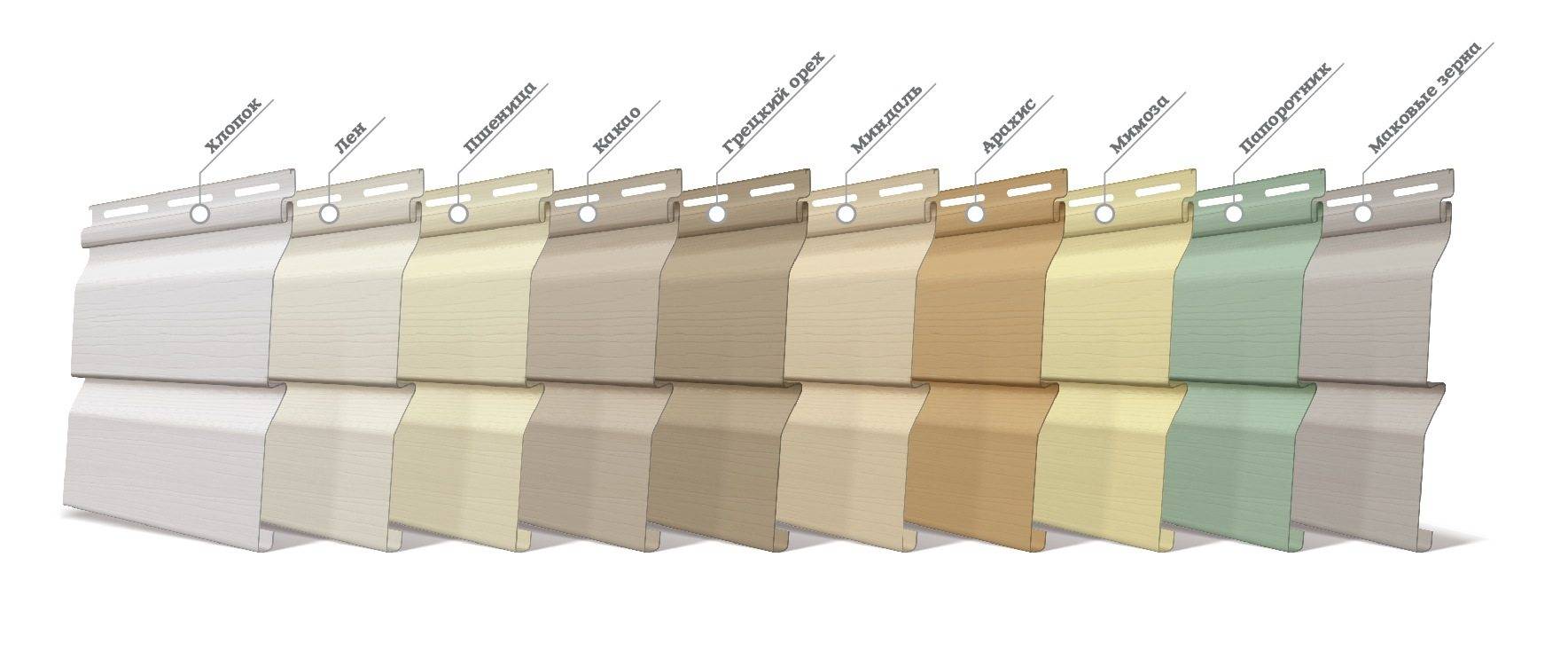 - Сайдинг «Орех». Стандартные размеры 2 см × 16,5 см × 400 см, толщина стенок 0,6 см, глубокая степенью рифления. Основная цветовая гамма недостаточно разнообразная и представлена коричневым, а также тёмно-коричневым оттенками.
