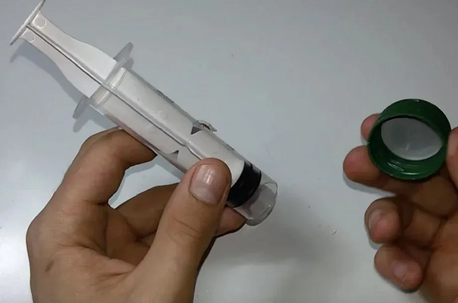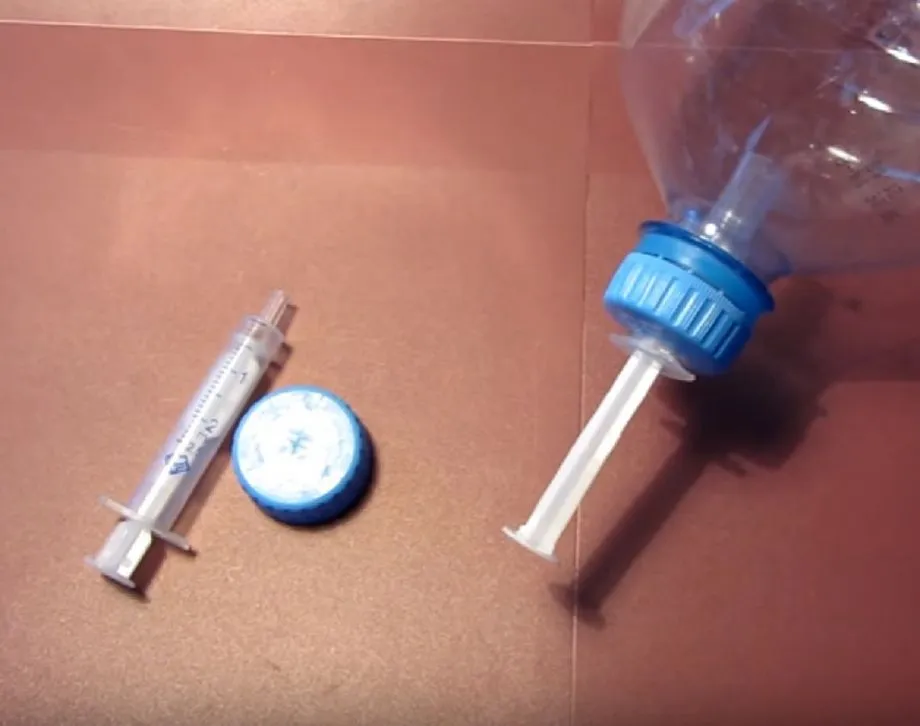 Вместо поршня советую использовать одноразовый пластиковый шприц на 5 кубов. В крышке бутылки просверливаю отверстие, совпадающее с диаметром медицинского инструмента. Конструкция должна легко входить в дыру, при этом жидкость не выливается. У устройства строительным ножом отрезаю участок с местом под иголку. Кромку тщательно зачищаю от заусенцев и неровностей.